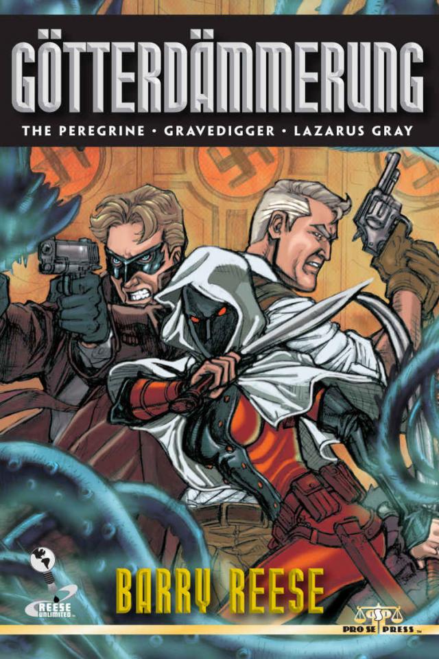 It’s 1938 as Götterdämmerung begins, and a newly married but weakened Lazarus Gray returns to the troubled metropolis, only to find it in greater danger than ever before. He senses the sudden increase of suicides is the harbinger of a coming encompassing terror. His fellow heroes The Gravedigger, The Perigrine and Gray’s own Assistance Unlimited crew are aware of the rising tide of evil, too. For the first time all are compelled to work as an uber-team against the machinations of evil whose seeds were sown a year before in Nazi Germany.