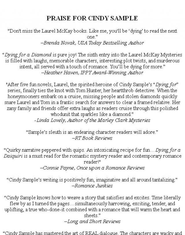 "After five fun novels, Laurel, the spirited heroine of Cindy Sample’s “Dying for” series, finally ties the knot with Tom Hunter, her heartthrob detective. When the honeymooners embark on a cruise, missing people and stolen diamonds quickly snare Laurel and Tom in a frantic search for answers to clear a framed relative. Her zany family and friends offer extra laughs as readers cruise through this polished whodunit that sparkles like a diamond.”