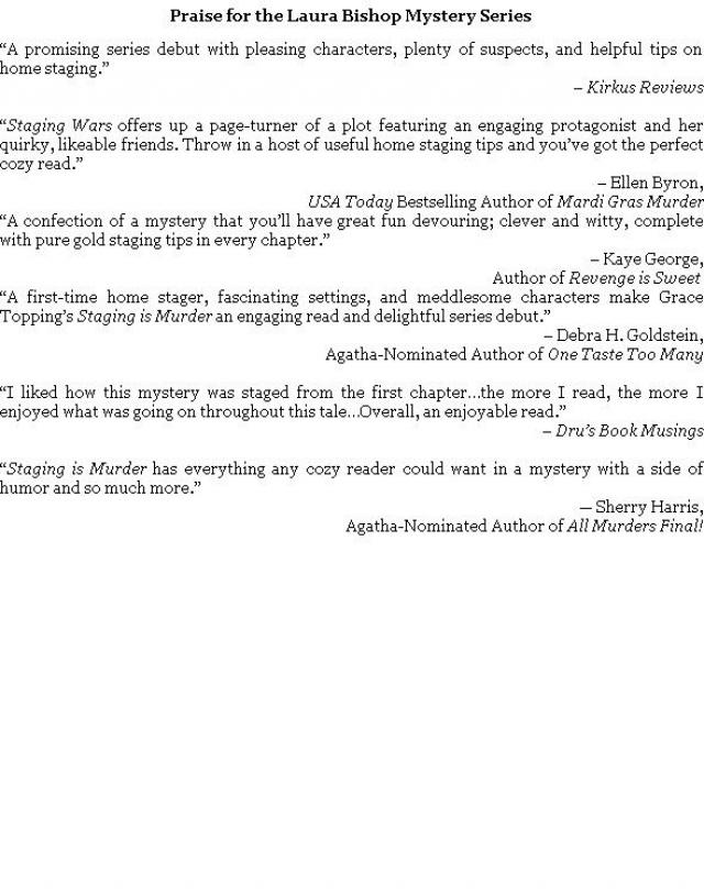 “A first-time home stager, fascinating settings, and meddlesome characters make Grace Topping’s Staging is Murder an engaging read and delightful series debut.”