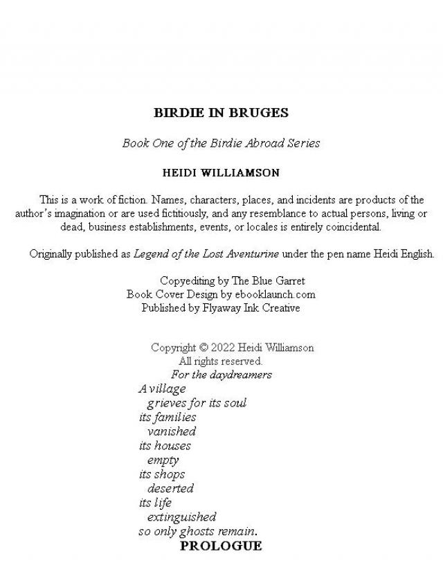 Birdie Blessing, a fifteen-year-old American with an unfortunate name and cheap luggage, tailed her mom through slippery cobblestone lanes at twilight on the longest day of the year. They’d missed their connecting train to Bruges at the sprawling station in Brussels, and now they were running late.