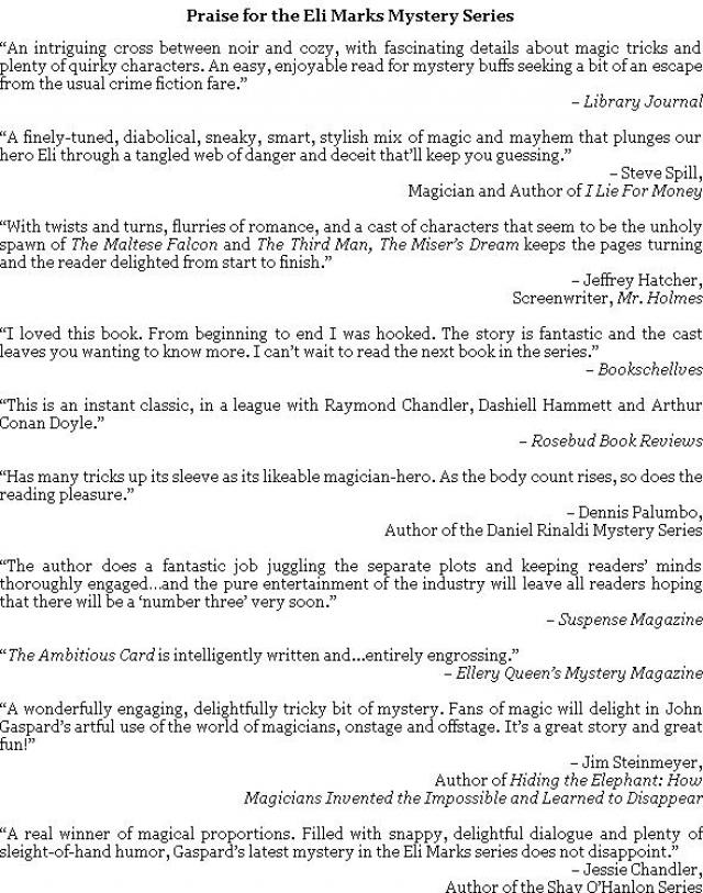 “A real winner of magical proportions. Filled with snappy, delightful dialogue and plenty of sleight-of-hand humor, Gaspard’s latest mystery in the Eli Marks series does not disappoint.”