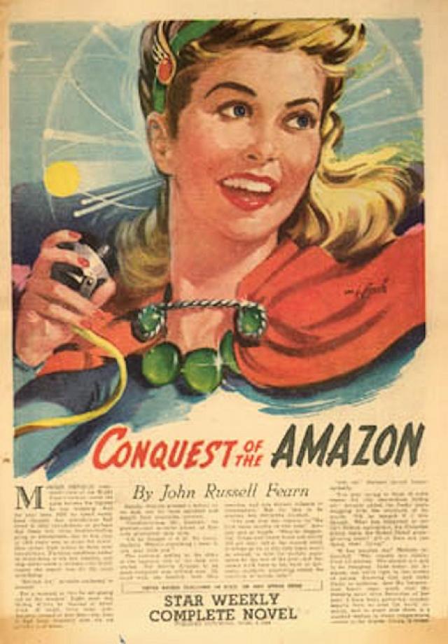 The Golden Amazon, however, attracted the attention of Toronto Star when it was submitted to them and they published it also, in the March 25th 1945 issue, as the novel of the week. Since that time every adventure of the Amazon has been published first by them, and the British version by World’s Work. But World’s Work, unfortunately, had more paper trouble than Toronto Star, which explains why the latter had published the sixth adventure by the time the second book was being issued.